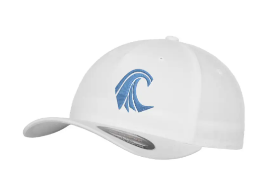 Nordic Storm Baseball style cap i hvid med lyseblå Storm-bølge logo. Hvid skygge.